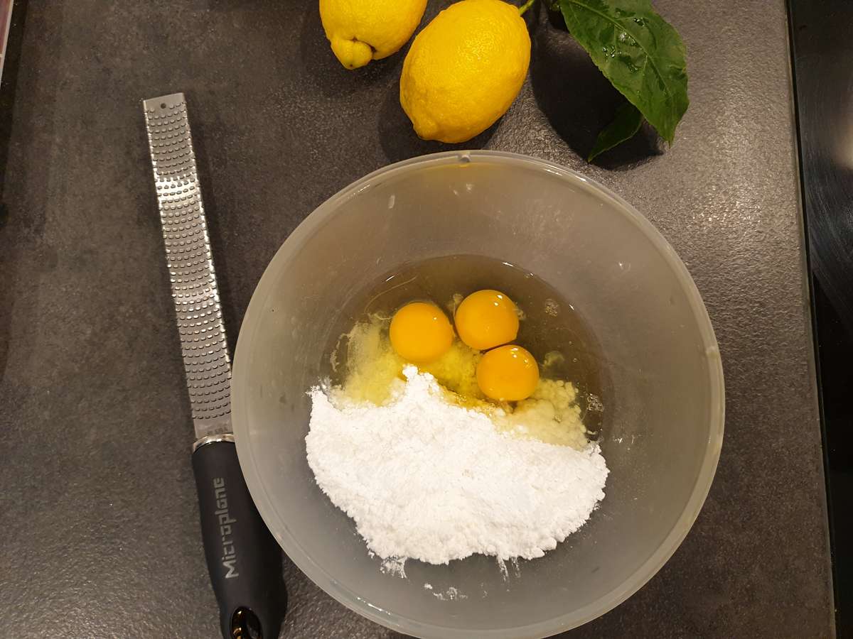 - Dans un cul de poule, mélanger les œufs, le sucre glace, le sel, la crème épaisse, le jus de citron et les zestes. Ne pas faire mousser.