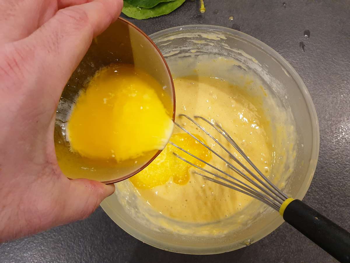 - Ajouter progressivement le beurre fondu refroidi jusqu’à obtention d’un appareil homogène sans grumeaux.