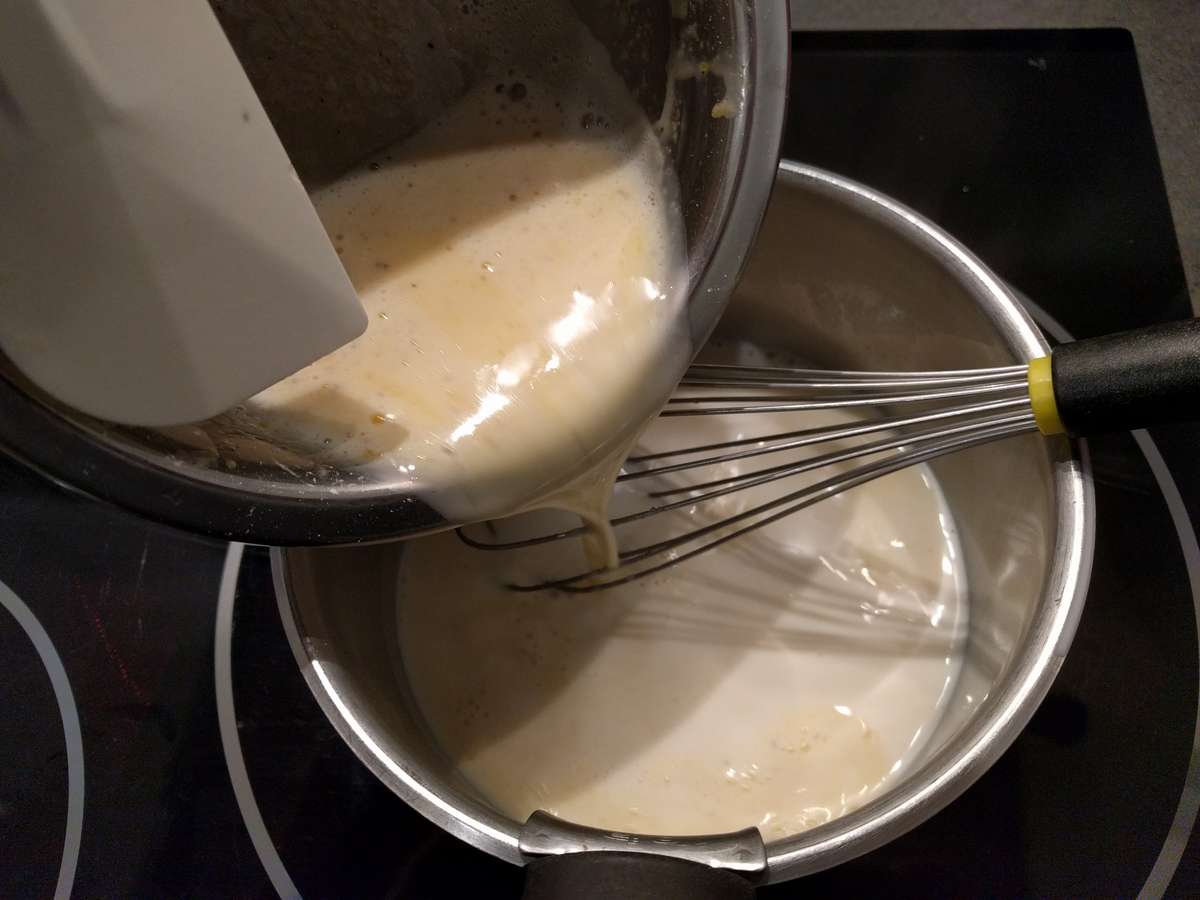 - Verser 1/3 du lait chaud sur le mélange blanchi et fouetter rapidement, puis reverser immédiatement le tout dans la casserole contenant le reste du lait chaud.
