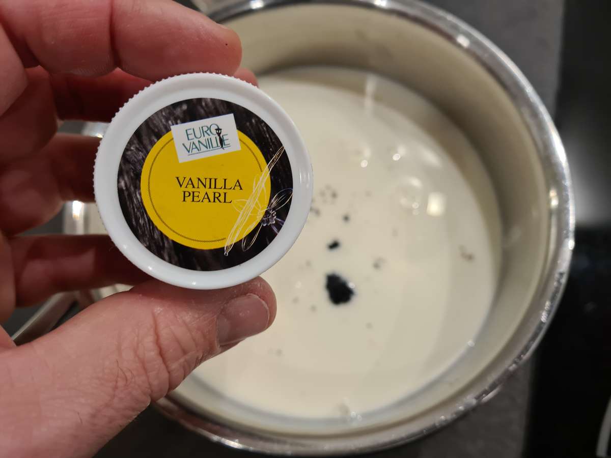 - Dans une casserole, verser le lait, gratter la gousse de vanille et y mettre les graines et gousse, chauffer sans faire bouillir.