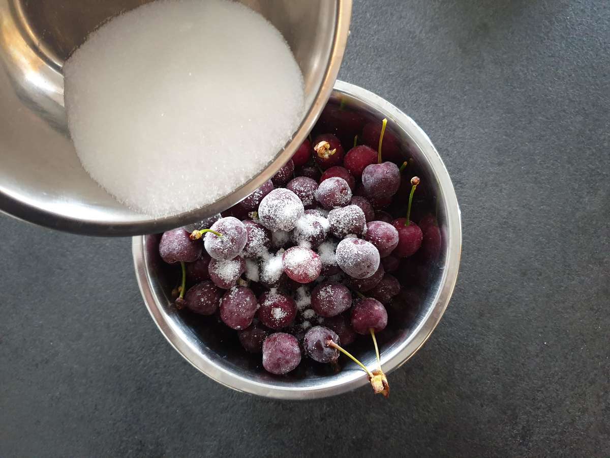 - Laver les cerises, les égoutter et les mettre les cerises dans un saladier, saupoudrer d’un peu de sucre afin de les enrober de sucre.