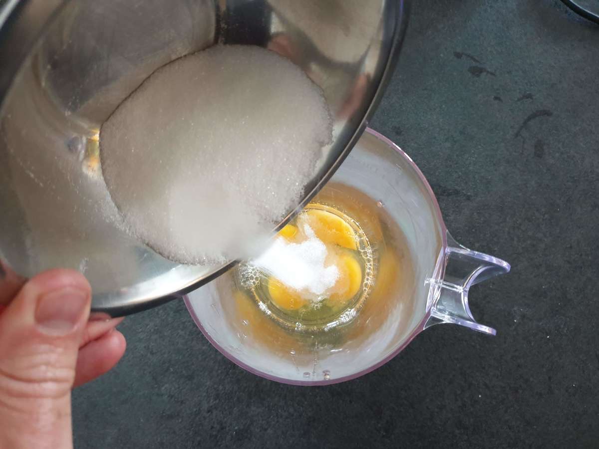 - Casser les œufs dans votre récipient, ajouter la pincée de sel et le sucre et mélanger à la main quelques instants.