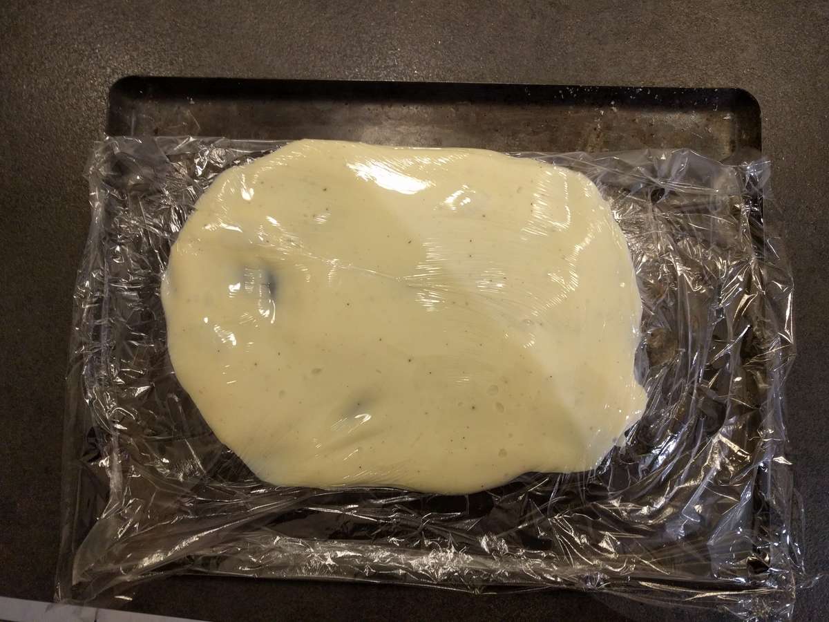 - Débarrasser dans votre grand plat à gratin congelé, filmer au contact à l’aide d’un film alimentaire et placer au réfrigérateur au moins 30 min. Toutefois, la crème devra être à environ 15 °C pour la mélanger à la réalisation ci-après, donc pas froide.