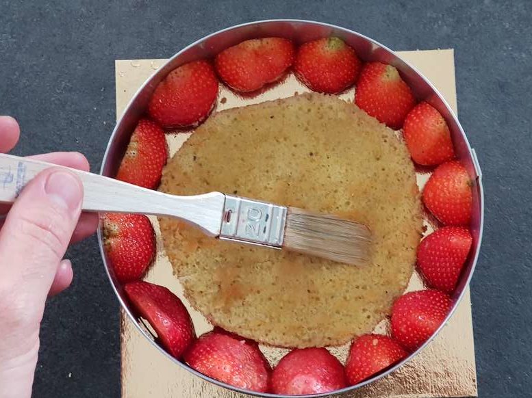 - À l’aide d’un pinceau, imbiber légèrement le biscuit avec le sirop.