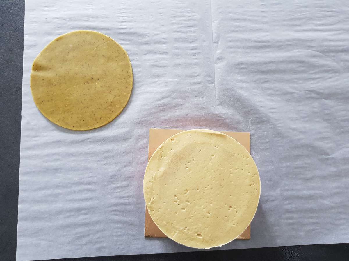 - En vous aidant d’une large spatule, coucher uniformément l’appareil sur deux plaques à pâtisserie recouvertes d’un papier cuisson, d’un silpat ou bien dans un moule silicone à Génoise. Lisser afin d’obtenir une épaisseur d’environ 5 mm maximum.