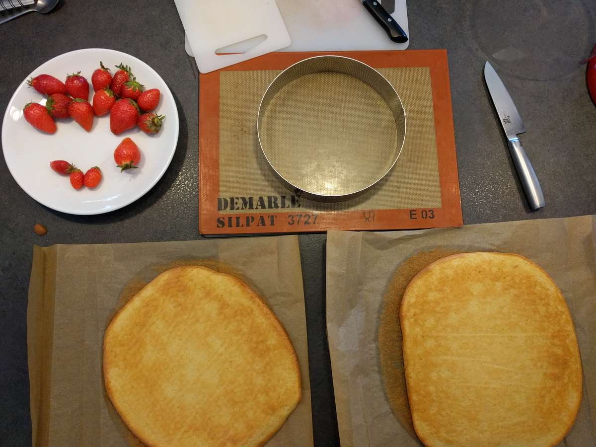 - Découper deux biscuits à l’aide d’un cercle d’environ 20 cm et le déposer un premier biscuit au fond, au centre des fraises.
