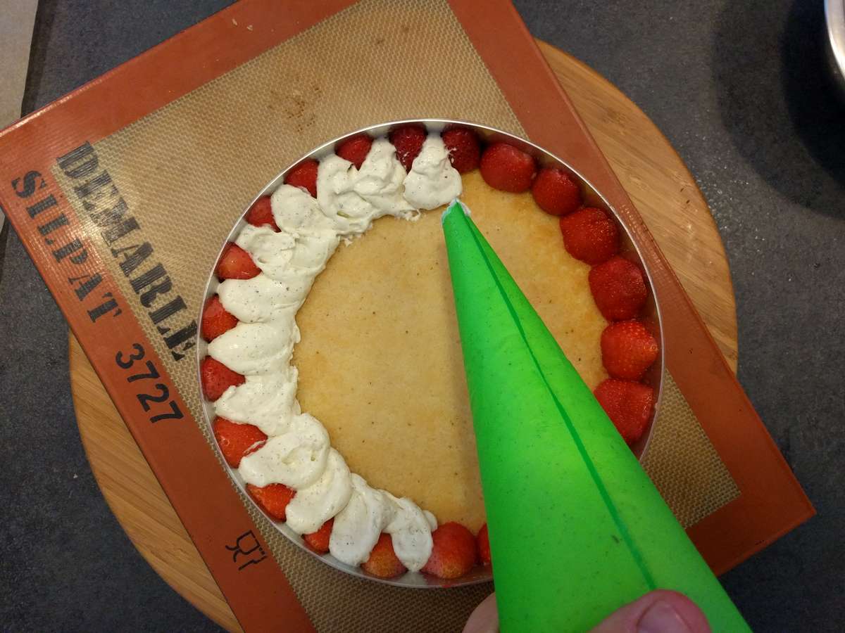 - Déposer soigneusement de la crème mousseline vanille entre les fraises puis sur le fond du biscuit sur 5 – 8mm.