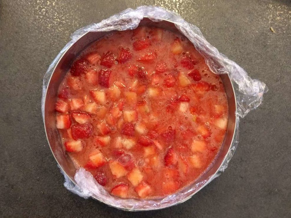 - Déposer environ 1 cm d’épaisseur de morceaux de fraises avec leur jus gélifié au centre du fraisier.