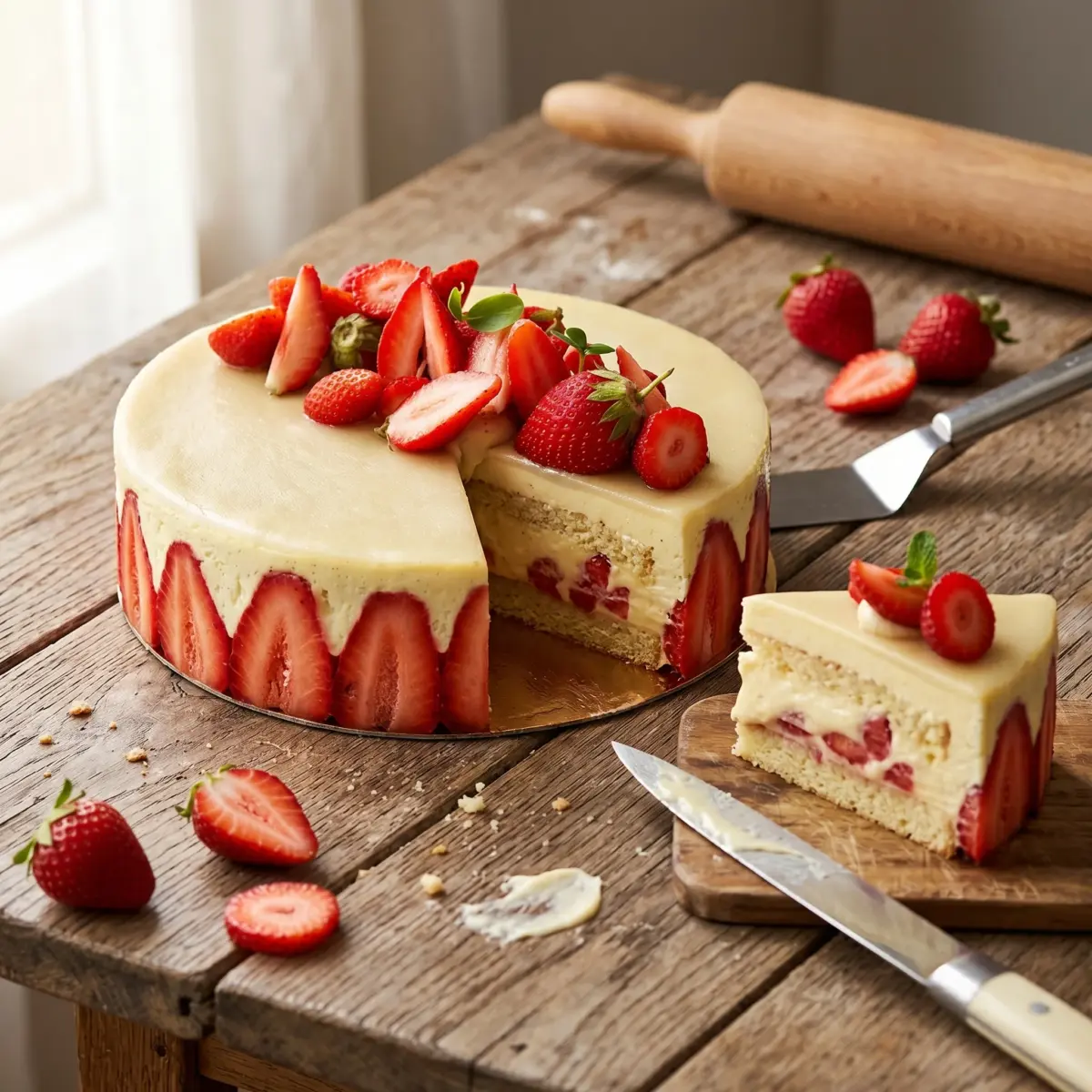 Contrairement à une génoise classique, j’utilise un Pain de Gênes pour obtenir un biscuit moelleux et aromatique. Le secret est un insert de fraises gélifié qui intensifie la saveur des fruits et assure une tenue parfaite.