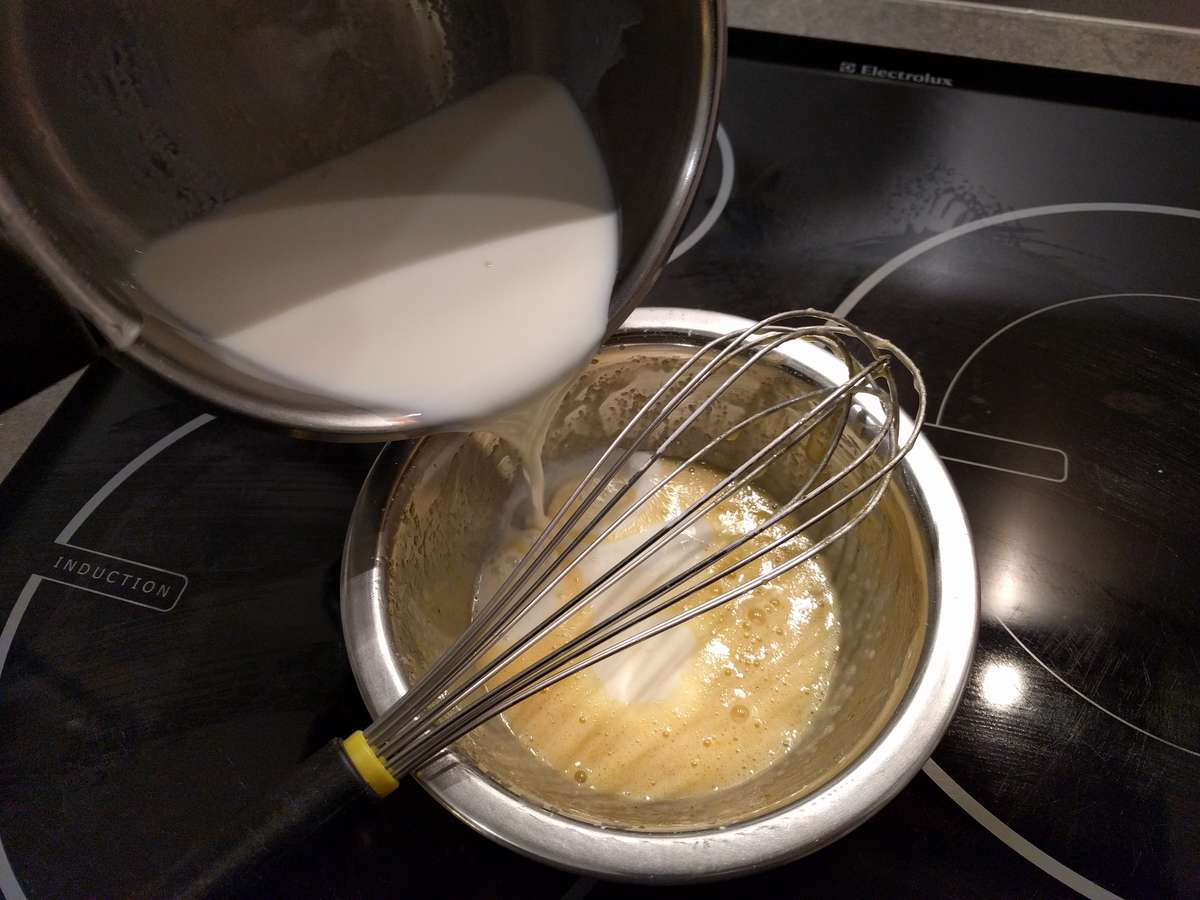- Verser 1/3 du lait chaud sur le mélange constitué des jaunes d’œufs/sucre/fécule et fouetter rapidement