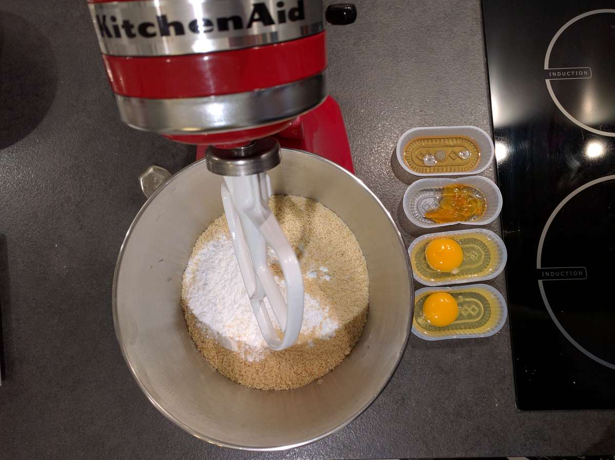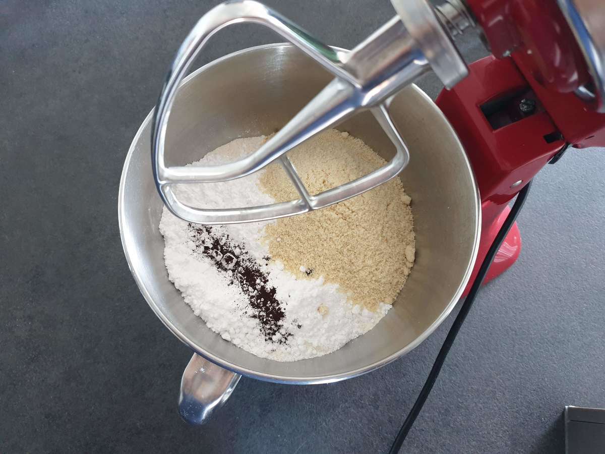 - Verser la farine, le sucre glace, la poudre d’amande, le sel et les éventuels arômes (grains de vanille, tonka…) dans la cuve du robot. Actionnez-le quelques instants pour mélanger les matières sèches.