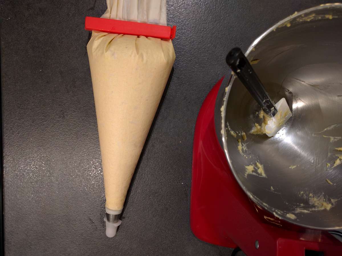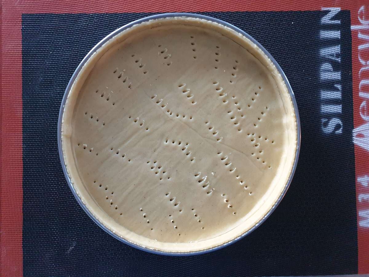 - Réserver en poche à douille et déposer une épaisseur ~ 7 mm sur le fond de tarte à venir