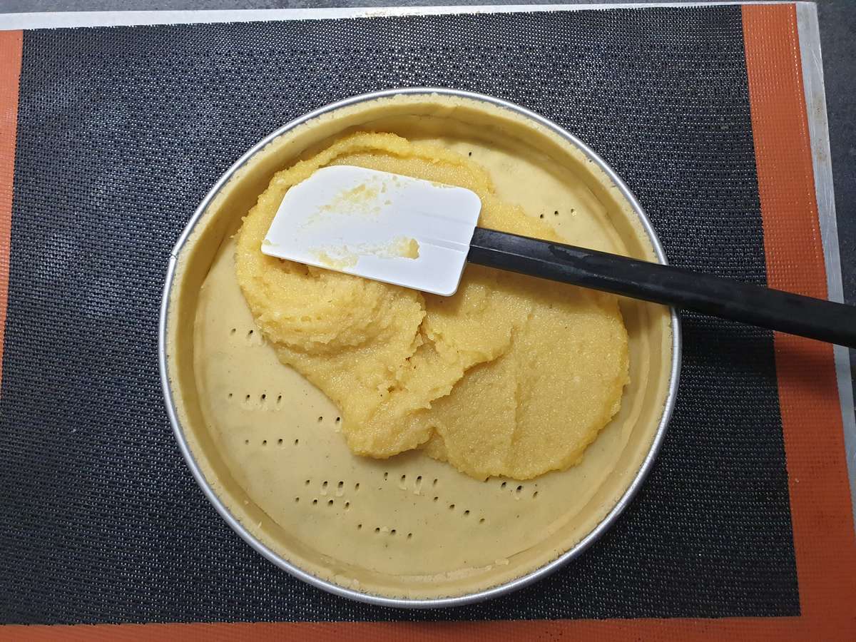 - Piquer la pâte puis déposer une couche de 4 mm environ de crème d’amande.
