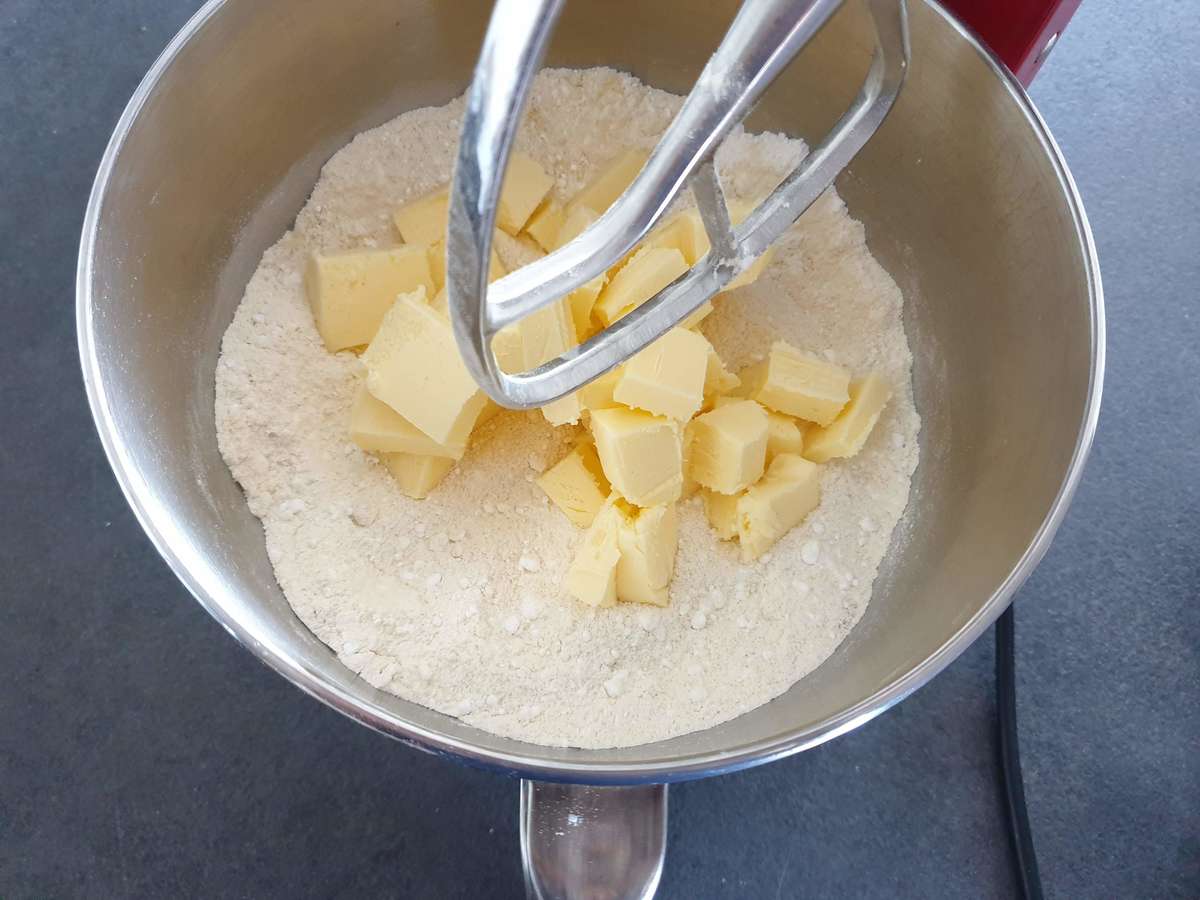- Mettre le beurre froid découpé en petit dès dans la cuve et actionner à nouveau le robot à vitesse moyenne. Stopper le robot quand vous avez une apparence de sable dans la cuve.