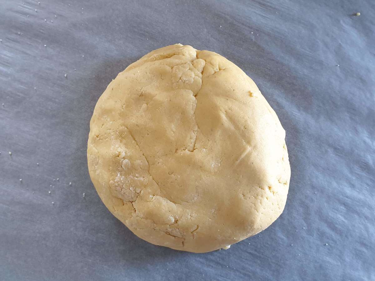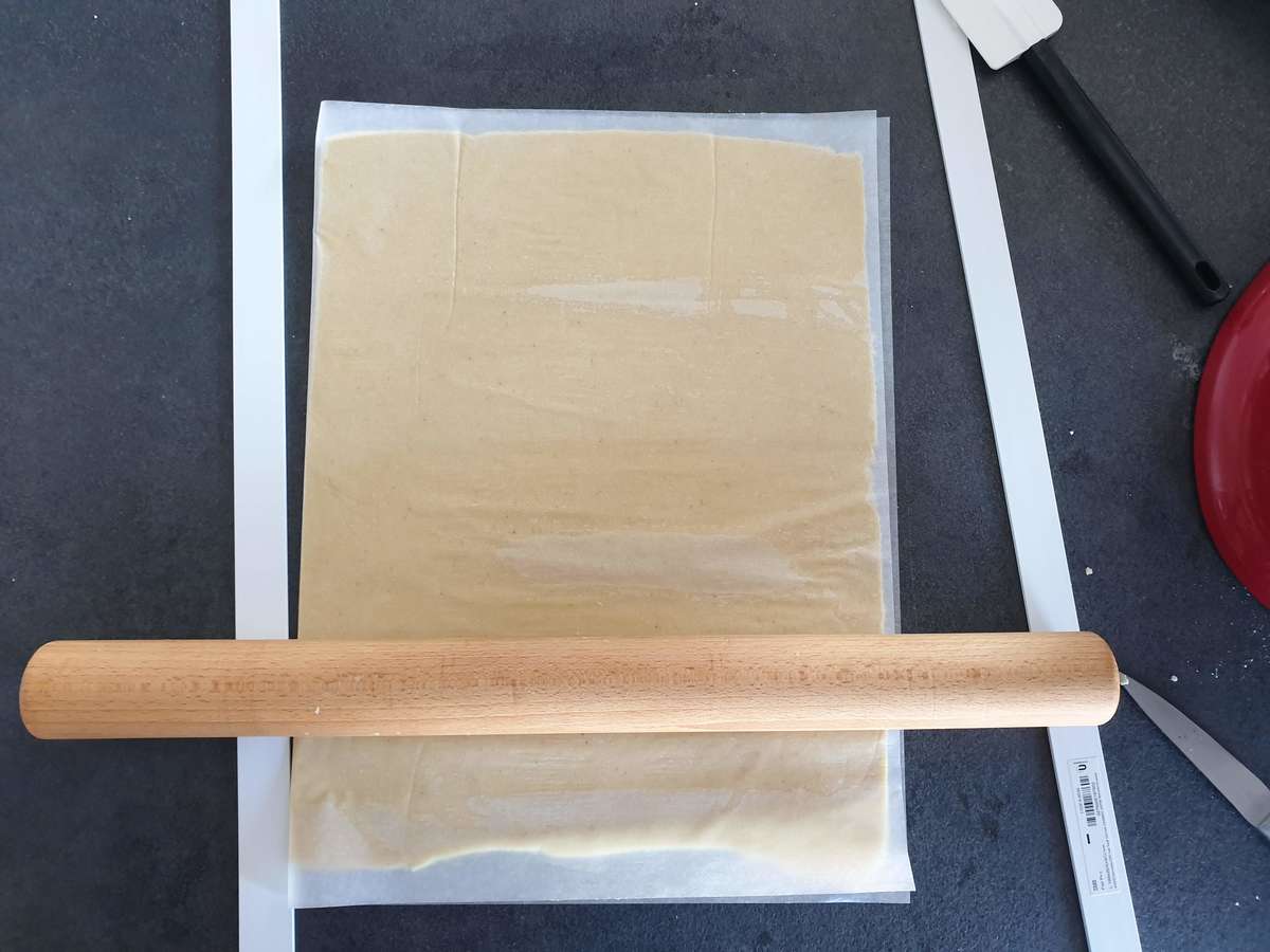 - Étaler la pâte sur environ 3 mm entre 2 feuilles de papier sulfurisé.