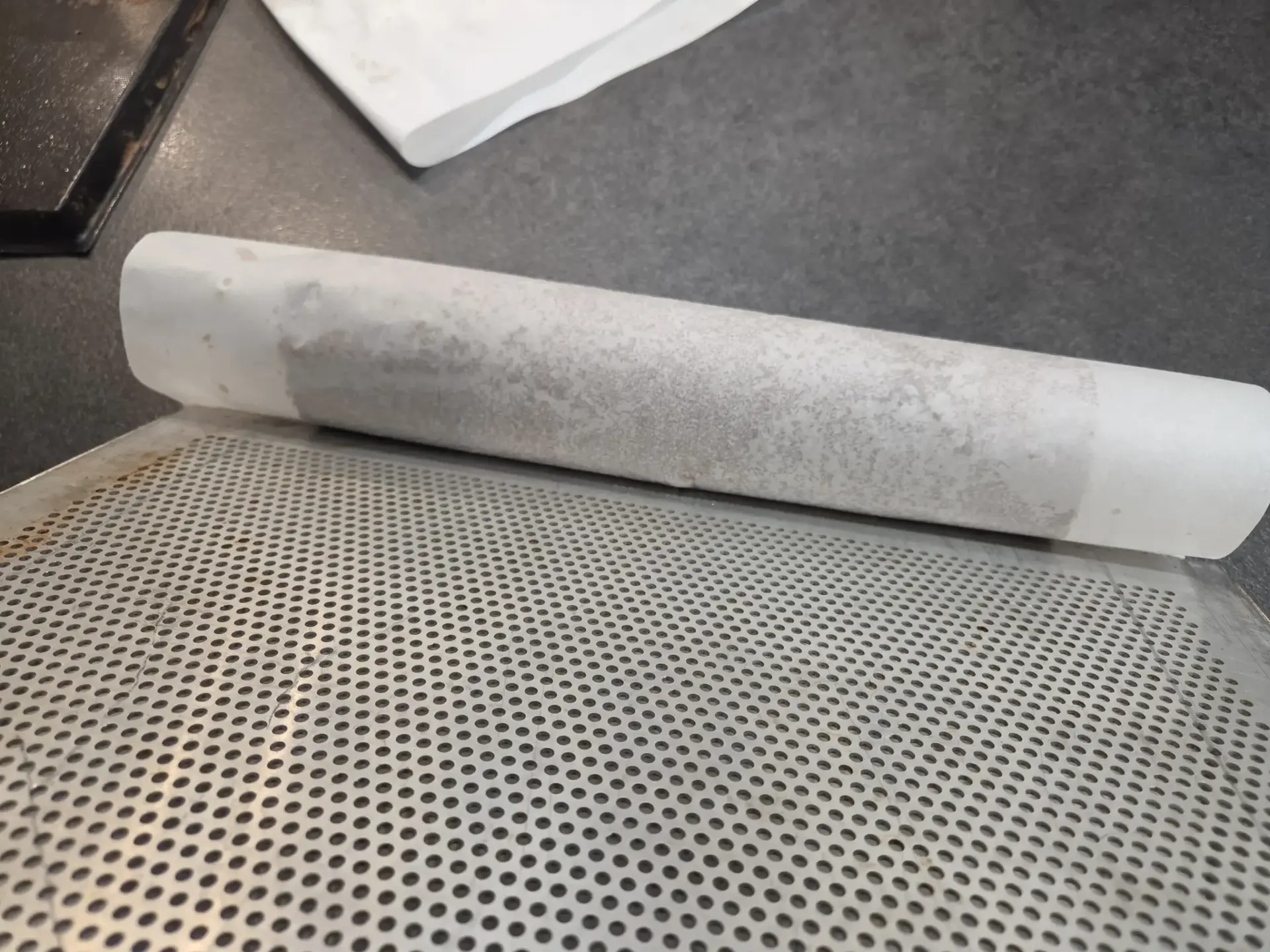 3. Disposez une seconde feuille de papier cuisson par-dessus puis roulez l’ensemble autour d’un objet cylindrique (rouleau, bouteille, tube) d’un diamètre proche de celui de votre future bûche.