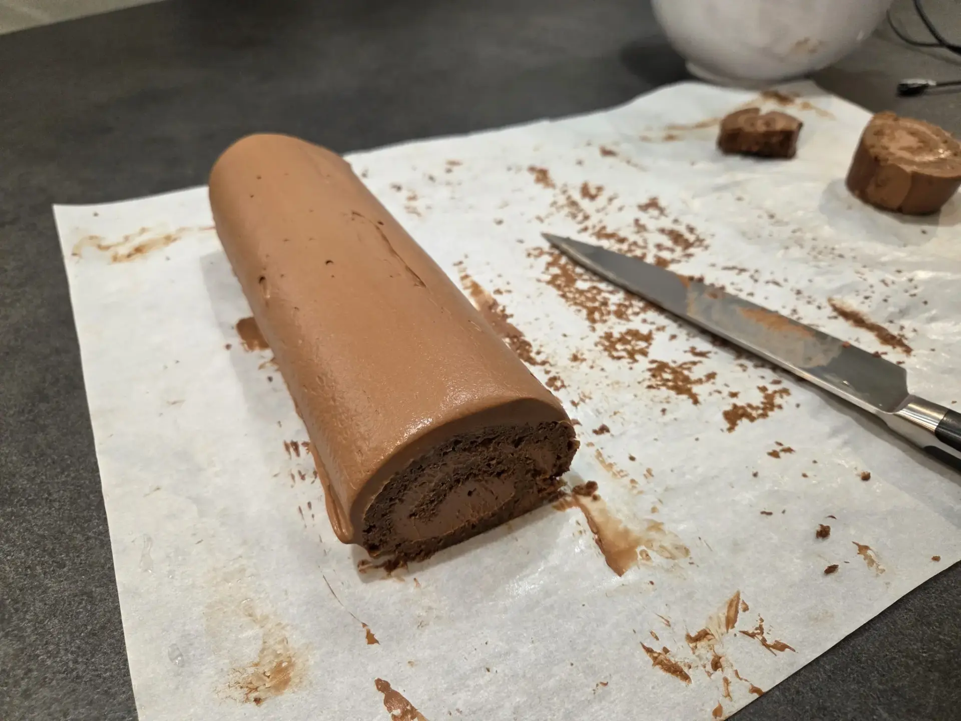 6. Sortez la bûche, parez les deux extrémités pour une coupe nette et régulière.
