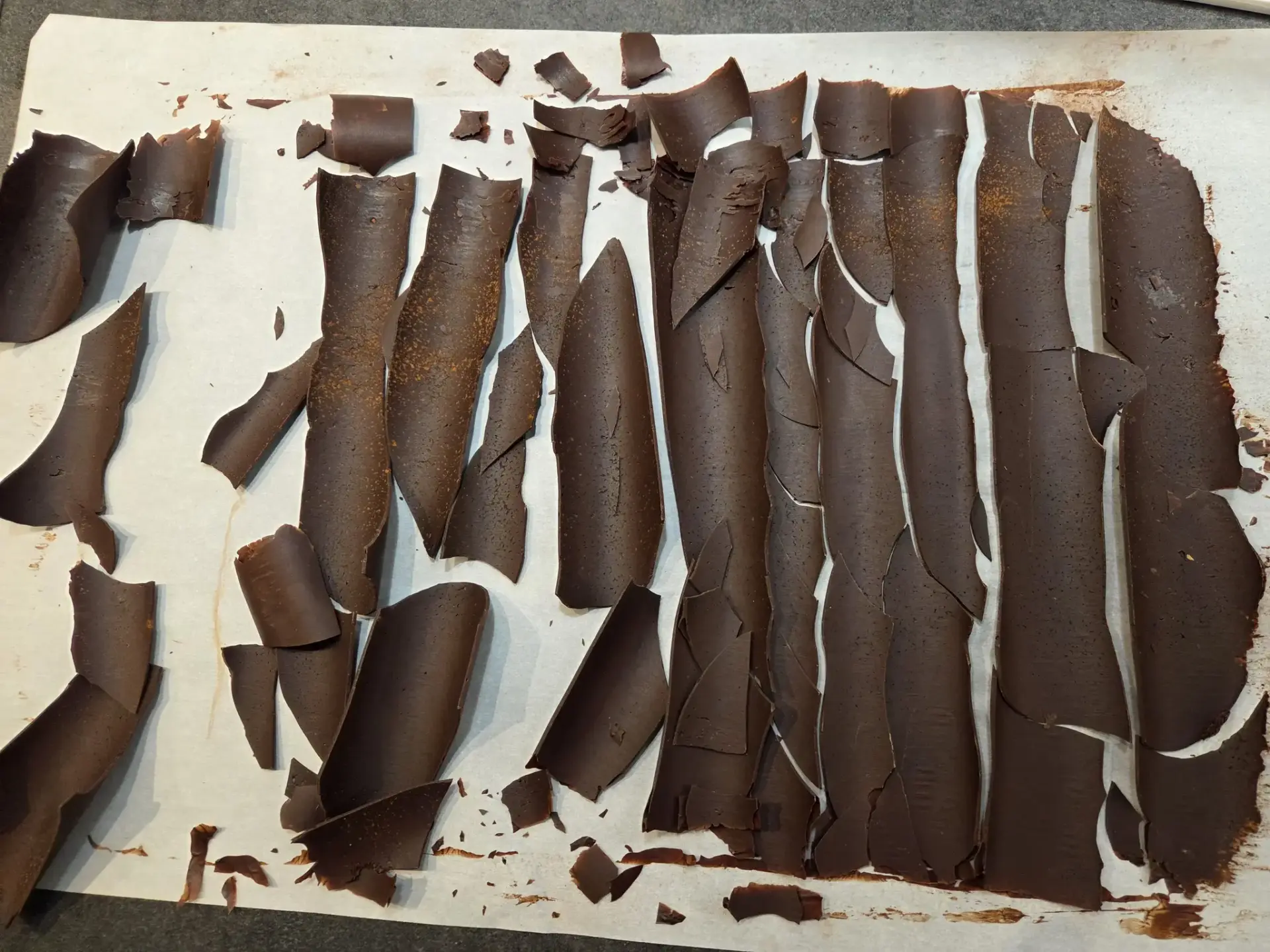 5. Récupérez votre rouleau de chocolat, retirez délicatement le papier cuisson : le chocolat non tempéré aura marbré et c’est justement l’effet recherché pour imiter l’écorce.