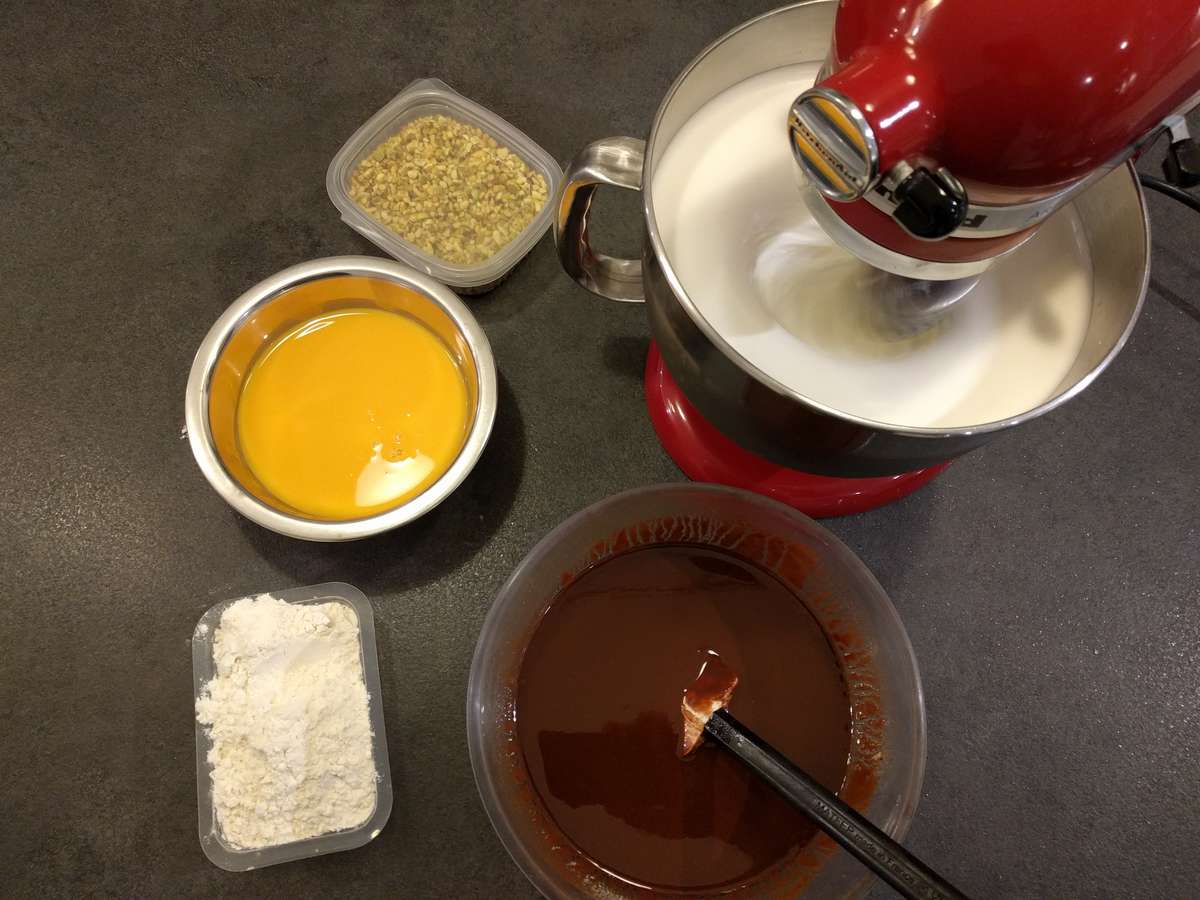 5. Prélevez l’équivalent d’une louche de cette préparation et mélangez-la sans précaution particulière avec le mélange chocolat et beurre fondus.