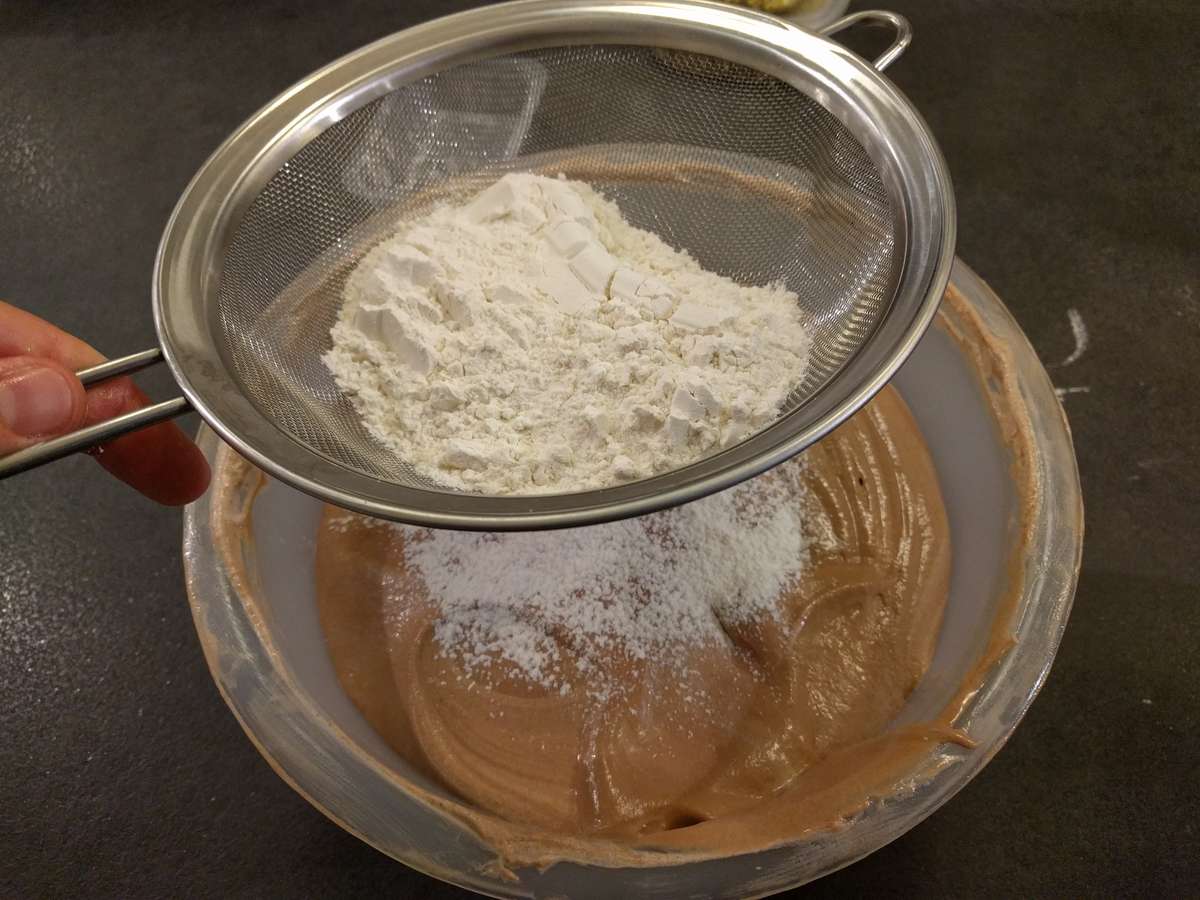 7. Terminez en incorporant délicatement la farine tamisée et la poudre de noisette si vous optez pour la version noisette. Pour la version simple, incorporez uniquement la farine.